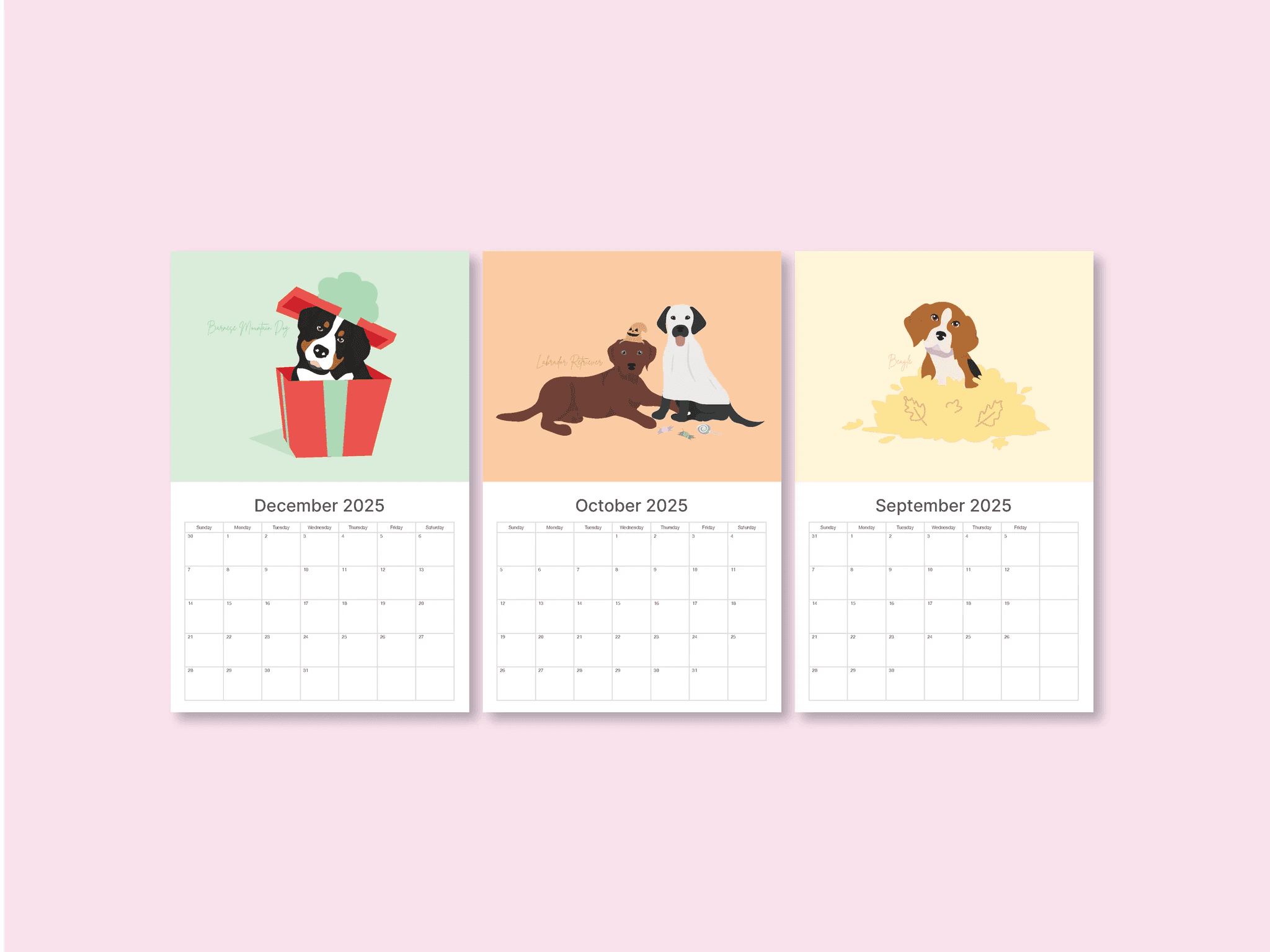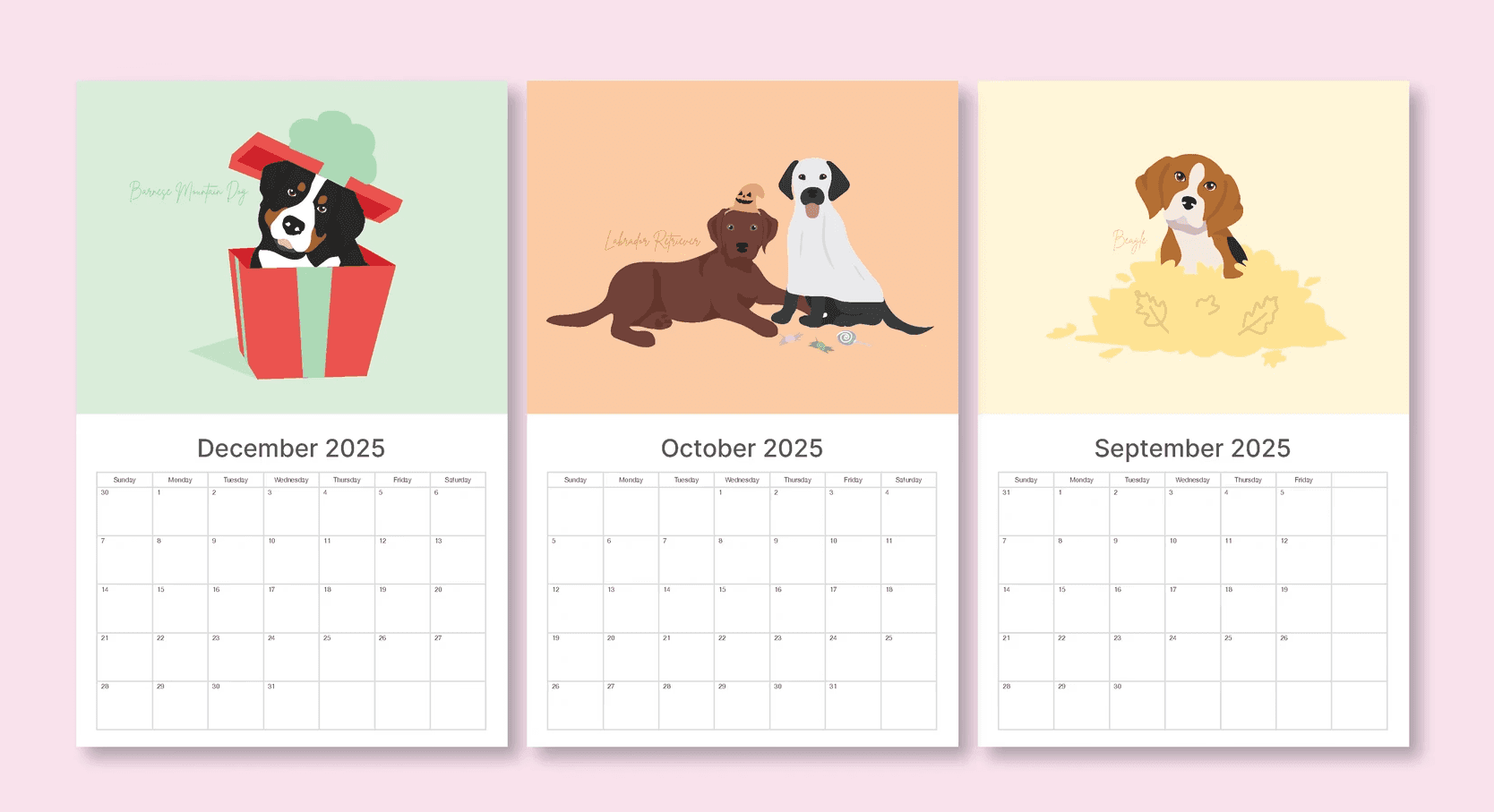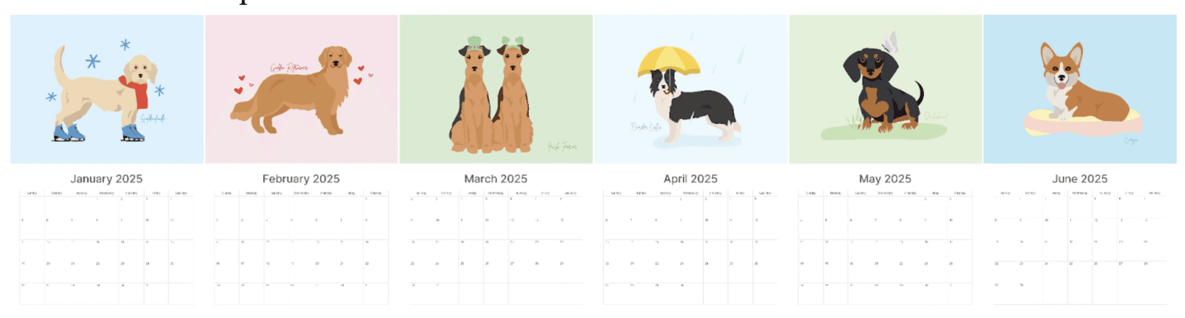 If there’s one thing I’m passionate about, it’s dogs. For my passion project I chose to make a wall calendar featuring a different dog illustration for each month. I wanted to illustrate in a style that was fun, playful, and visually appealing. Furthermore, to make the designs more intentional, I added a sprinkle of each month into its illustration, challenging myself to think of a creative way to intertwine both the dog and the theme of the month. Beyond wanting to ensure the illustration reads well as both a poster and a calendar, I wanted to use this project as a way to improve my illustration skills.