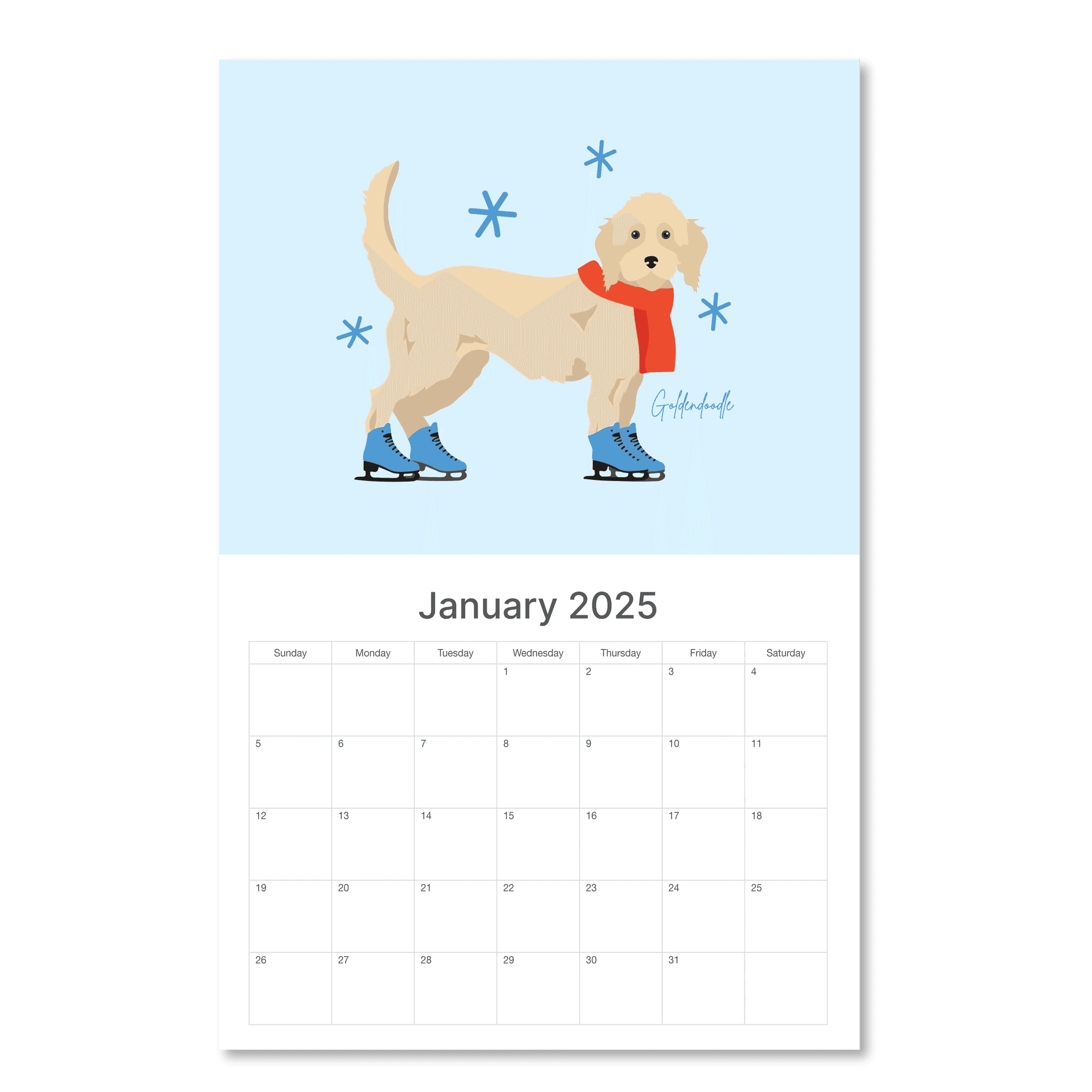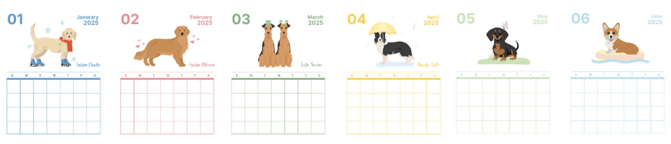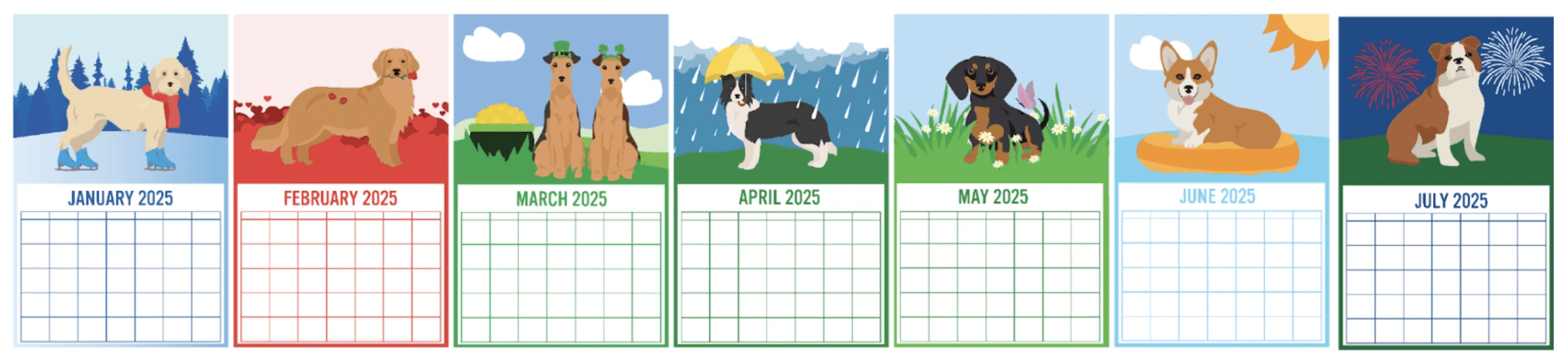 If there’s one thing I’m passionate about, it’s dogs. For my passion project I chose to make a wall calendar featuring a different dog illustration for each month. I wanted to illustrate in a style that was fun, playful, and visually appealing. Furthermore, to make the designs more intentional, I added a sprinkle of each month into its illustration, challenging myself to think of a creative way to intertwine both the dog and the theme of the month. Beyond wanting to ensure the illustration reads well as both a poster and a calendar, I wanted to use this project as a way to improve my illustration skills.